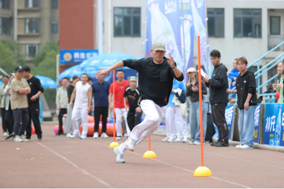 作为竞技类亮点项目,“绕杆接力”考验着速度与技巧的完美融合。发令声一响,队员们如离弦之箭般冲出起点,在四根障碍杆间灵活穿梭、极速折返,绕杆、转身、冲刺一气呵成,身姿矫健如飞。与队友击掌交接的瞬间,掌心传递的不仅是比赛的接力权,更是信任与力量。赛道旁,加油声、呐喊声、喝彩声此起彼伏,大家为每一次精准绕杆鼓劲,为每一次快速交接欢呼,充分展现了教职工们奋勇争先、永不言弃的竞技风采。